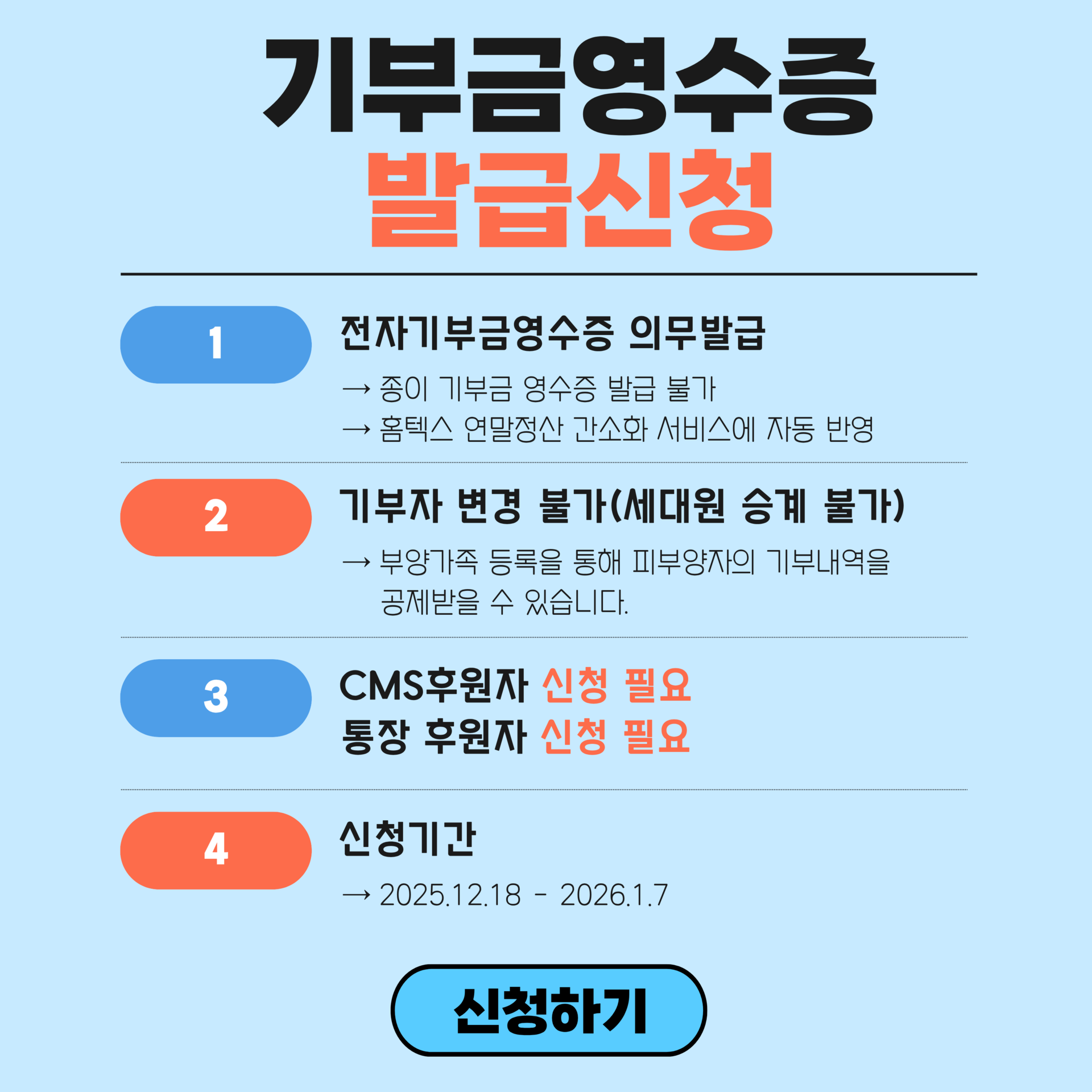 기부금 영수증 신청은 홈페이지를 통해서만 가능합니다.